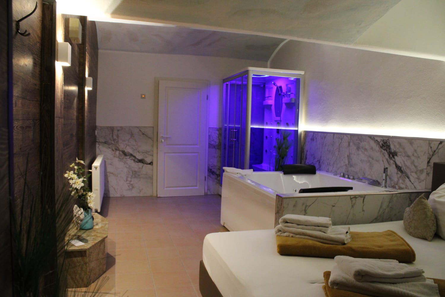 Erleben Sie ein Romantisches Badewannenbad zu Zweit. Bei Kerzenschein & Wein.
