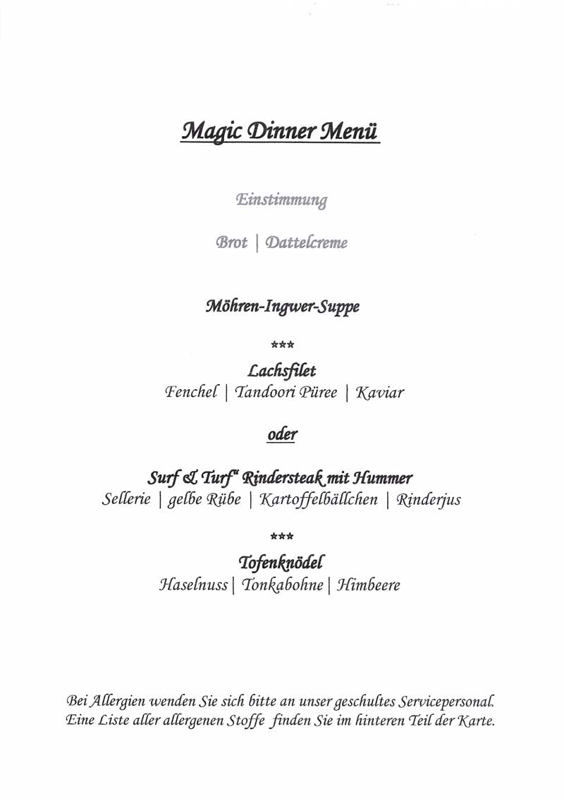 incl. 3 Gang Menü ,Preis pro Person : 99.00 €